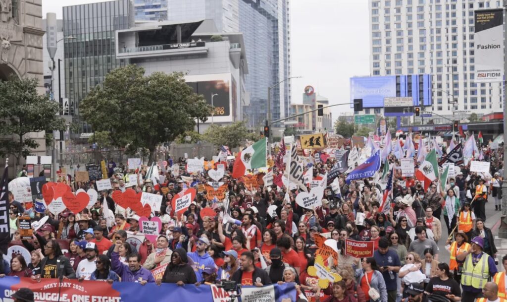 Ciudad de México., a 1 de mayo del 2025.- Miles de personas marcharon el 1 de Mayo en Estados Unidos como parte de las protestas nacionales contra la administración de Donald Trump, sus políticas y los multimillonarios como Elon Musk que la apoyan, en lo que los organizadores llaman “una guerra contra los trabajadores”.